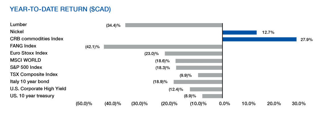 However, we are starting to see some light at the end of the tunnel. The things that were most concerning for markets at the start of the year are starting to show some change and potentially normalize. Recession fears are starting to be priced in the markets. This is most evident in the commodity space with lumber down 42% while copper, nickel and zinc are down between 20% & 25% from their peaks. With the magnitude of the expected Federal reserve tightening, as evidence by the bond market’s pricing in a Fed Fund at 3.6%, the risk of a recession is quite high. Goldman Sachs puts a risk of a recession at over 40%. The markets are now grappling with the timing of the recession and its severity, which will obviously impact corporate earnings.