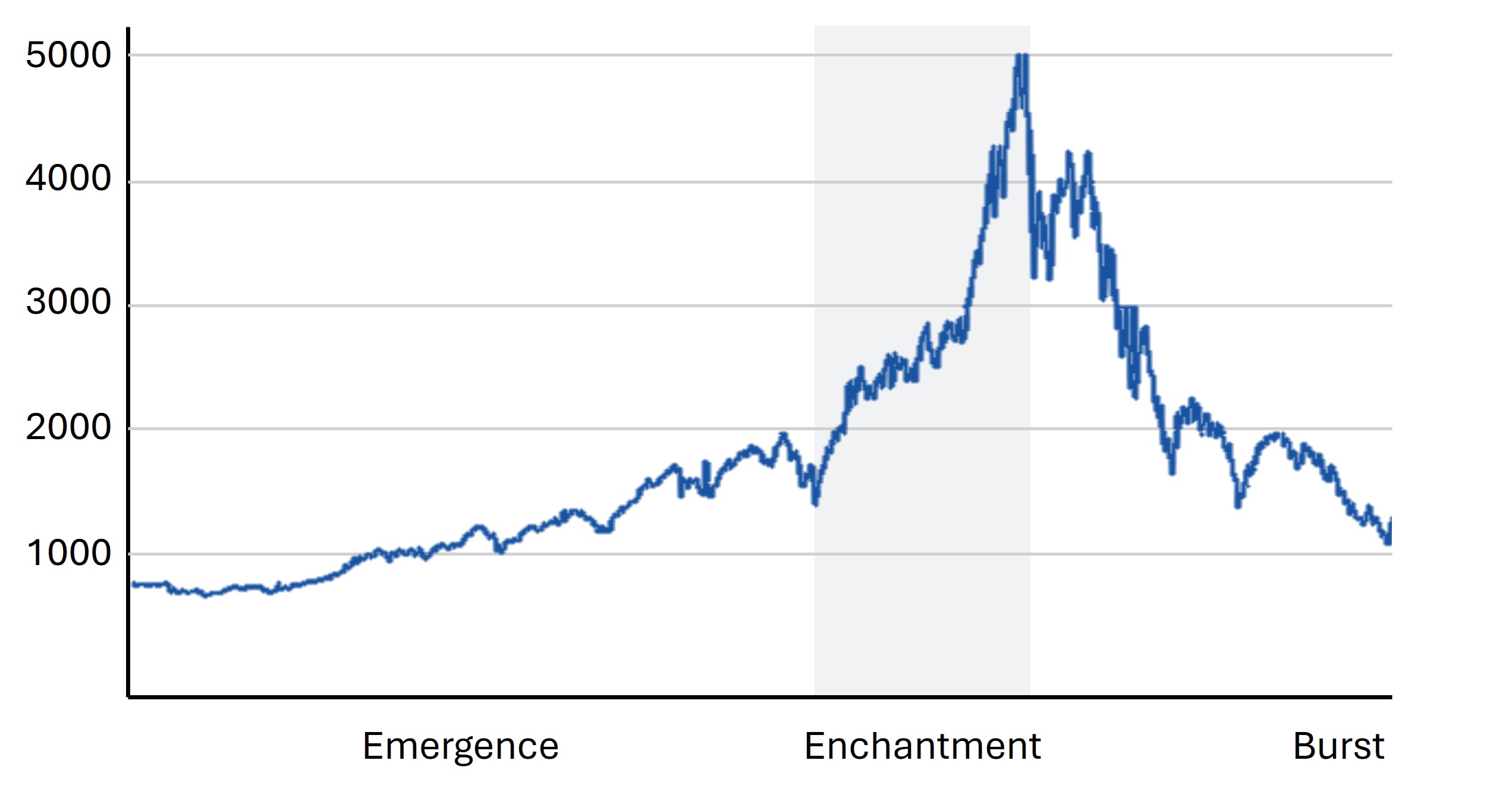 All indications suggest that the current enthusiasm for new technologies, particularly artificial intelligence, gives the appearance of a bubble in its enchantment phase. Only time will tell, as the existence of a speculative bubble is generally only confirmed after it collapses.