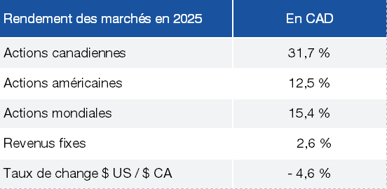Ultimement, l’ampleur des tarifs s’est avérée moindre qu’appréhendée et les banques centrales nord-américaines ont pu continuer de réduire leurs taux directeurs. Cette évolution a été favorable aux marchés, à l’économie et aux entreprises du secteur financier. Par ailleurs, l’enthousiasme entourant l’intelligence artificielle s’est maintenu dans l’ensemble. L’Europe a bien fait alors que l’écart défavorable de multiples par rapport à l'Amérique s’est atténué. Au Canada, l’or a continué de bénéficier de son rôle de valeur refuge dans un contexte d’incertitude géopolitique croissante. Le résultat aura été de forts rendements presque partout dans le monde - surtout au Canada (31,7%) et en Europe (29,1%).