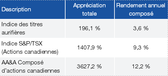 Afin de quantifier l’impact de cette philosophie à long terme, nous avons comparé le rendement des titres aurifères (les compagnies minières) à ceux du marché boursier canadien et de notre portefeuille d’actions canadiennes depuis nos débuts en juillet 1995 (voir le tableau à la page suivante). Sur cette période de plus de 30 ans, l’absence de titres aurifères a contribué favorablement aux rendements de nos clients.
